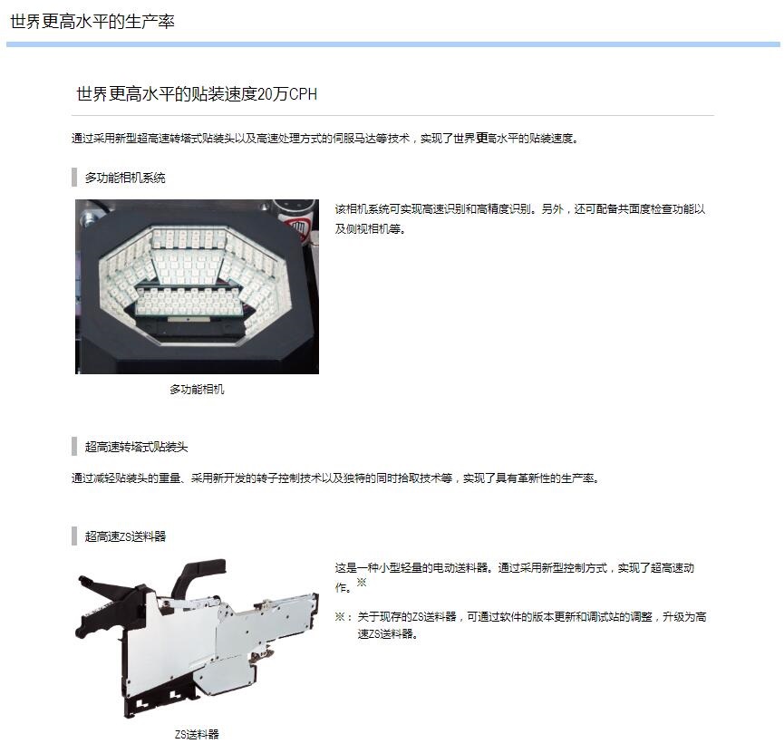 1.采用小巧的平臺構(gòu)造,達(dá)成了世界更高水平的貼裝速度20萬CPH※,實(shí)現(xiàn)了生產(chǎn)率的全面革新。
