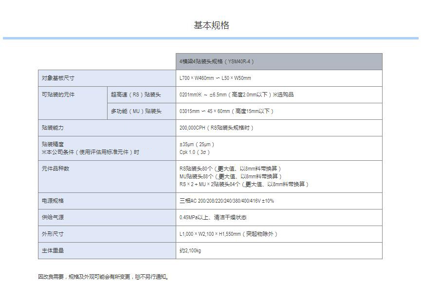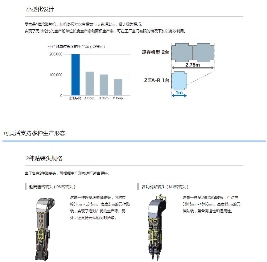 Z:TA-R YSM40R超高速模塊貼片機(jī) 1.采用小巧的平臺構(gòu)造,達(dá)成了世界更高水平的貼裝速度20萬CPH※,實(shí)現(xiàn)了生產(chǎn)率的全面革新。2.全球更高生產(chǎn)率。3.靈活支持多種生產(chǎn)形態(tài)。4.支持高品質(zhì)貼裝和高運(yùn)轉(zhuǎn)率的技術(shù)。※:與4橫梁/4貼裝頭的同級別貼片機(jī)在更佳條件下的貼裝能力(CPH)對比。基于2016年4月本公司的調(diào)查結(jié)果。