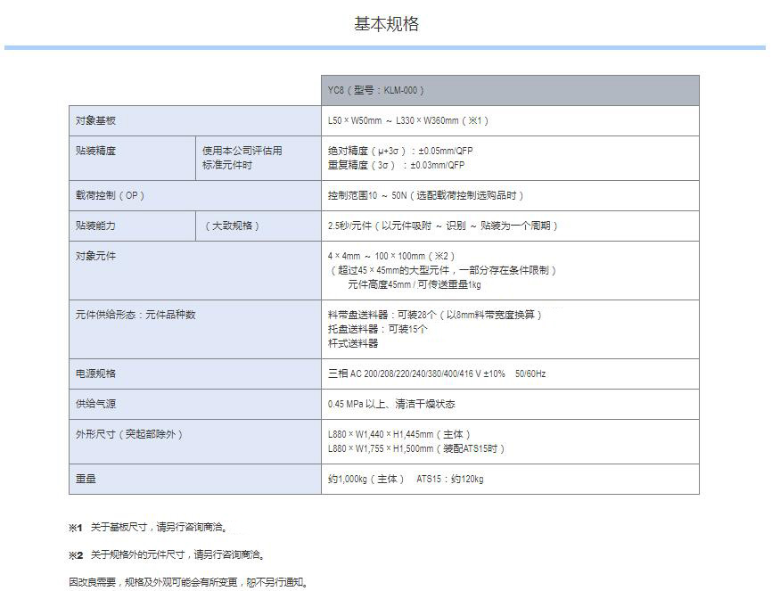 YC8 支持大型、不規(guī)則元件的小巧型模塊式貼片機(jī) 1.可貼裝較大尺寸達(dá)100mm×100mm、高達(dá)45mm的元件。2.支持貼裝重達(dá)1kg的元件,還具備壓入元件的功能。3.機(jī)身僅寬880mm的小型化設(shè)計(jì),可大限度地有效利用空間。4.支持可裝15張托盤的自動(dòng)更換式托盤供給裝置 ATS15。5.支持SS型電動(dòng)送料器與ZS型電動(dòng)送料器。