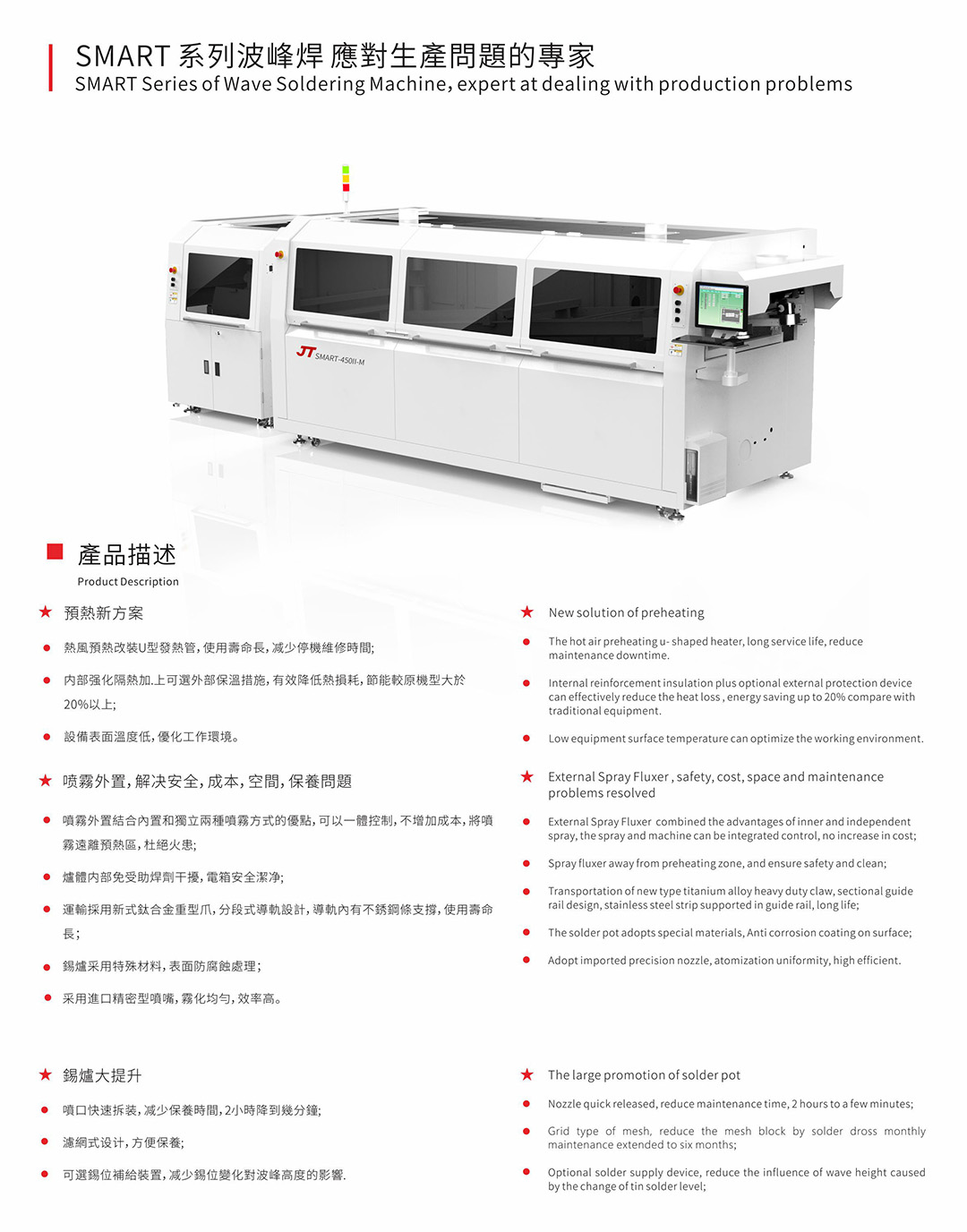 噴霧外置結(jié)合內(nèi)置和獨(dú)立兩種噴霧方式的優(yōu)點(diǎn),可以一體控制將噴霧遠(yuǎn)離預(yù)熱區(qū),杜絕禍患。爐體內(nèi)部免受助焊劑干擾,電箱安全清潔。為四段預(yù)熱節(jié)省空間的同時(shí)減少前段接駁臺的使用。外置噴霧導(dǎo)軌角度可調(diào),代替入口接駁功能。熱風(fēng)預(yù)熱改裝U型發(fā)熱管,使用壽命長內(nèi)部強(qiáng)化隔熱加上可選外部保溫措施,有效降低熱損耗。設(shè)備表面溫度…